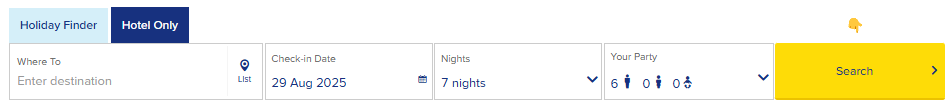 👉 Head to our app or website and select the Hotel Only tab. Choose your destination, check-in date and how many nights you want to stay, then tap Search.
