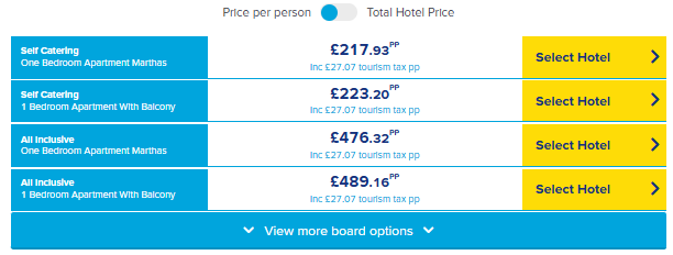 👉 Take a look at the room types and board options for your chosen hotel. When you spot the one that works for you, tap Select Hotel.